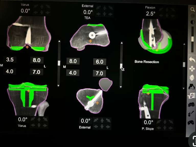 Historically, bone cuts during total and partial knee replacement have been made using manual alignment jigs. This requires the surgeon to use bony landmarks and their own experience to make the series of bony cuts required for implant insertion. While effective, performing these cuts manually does introduce a certain degree of variability into the procedure due to surgeon, patient, or implant-related factors. The use of robotics and computer navigation reduces this variability, and improves the surgeon's ability to place implants with a high degree of accuracy. Multiple points of reference using the patient's own anatomy are registered into the computer, and the implants can be modeled virtually onto a 3D reconstruction of the patient's bone. When the final plan is executed, the implant is then positioned to restore the patient's native anatomy and promote optimal soft tissue balance.